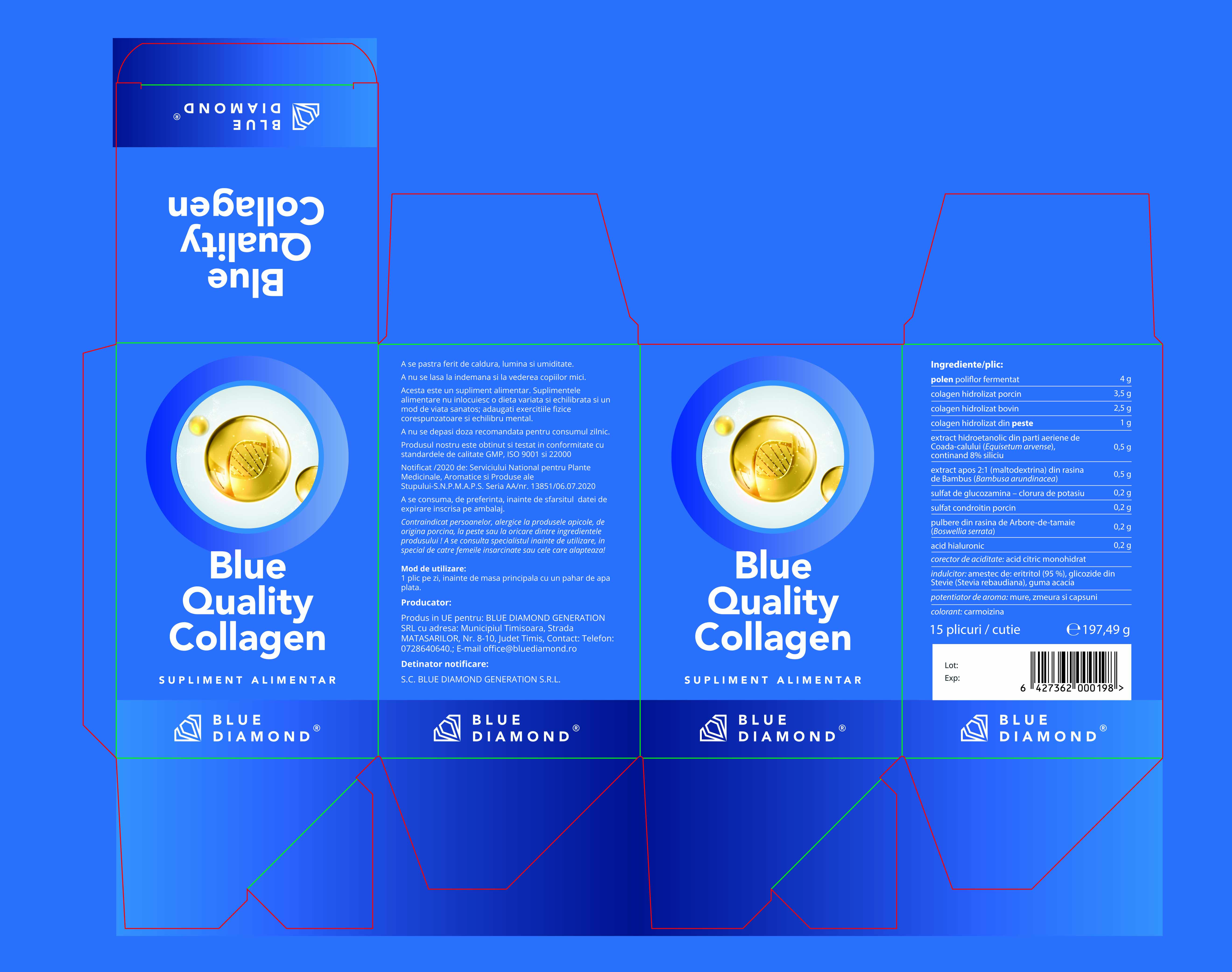 Blue Quality Collagen conține 3 tipuri de colagen: marin (pește), porcin și bovin. Întărește sănătatea oaselor și a articulațiilor. Întărește sănătatea musculară. Întărește sănătatea epidermei (pielii), părului și a unghiilor.