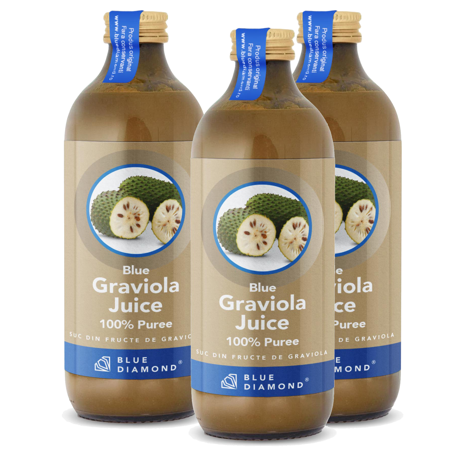 Sanatate din 'farmacia' naturii - ste un suc/piuree pur 100% din fructe Graviola proaspete și coapte  - fara adaos de apa, conservanti sau orice alta substanta Graviola este utilizata pentru a lupta impotriva infectiilor grave, ca intaritor al sistemului imunitar, antibiotic natural, antiparazitar, antifungic, anti-tumoral superior. Pachetul contine 3 sticle cu Graviola Juice 100%