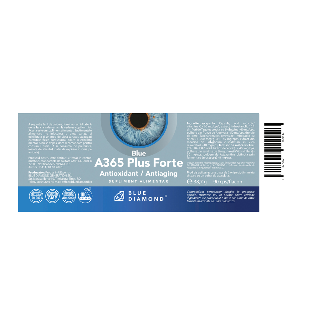 Blue A365 PLUS Forte este un antioxidant natural Repara celulele si neutralizeaza efectele negative ale radicalilor liberi Creste imunitatea organismului in fata bolilor si stimuleaza formarea de anticorpi